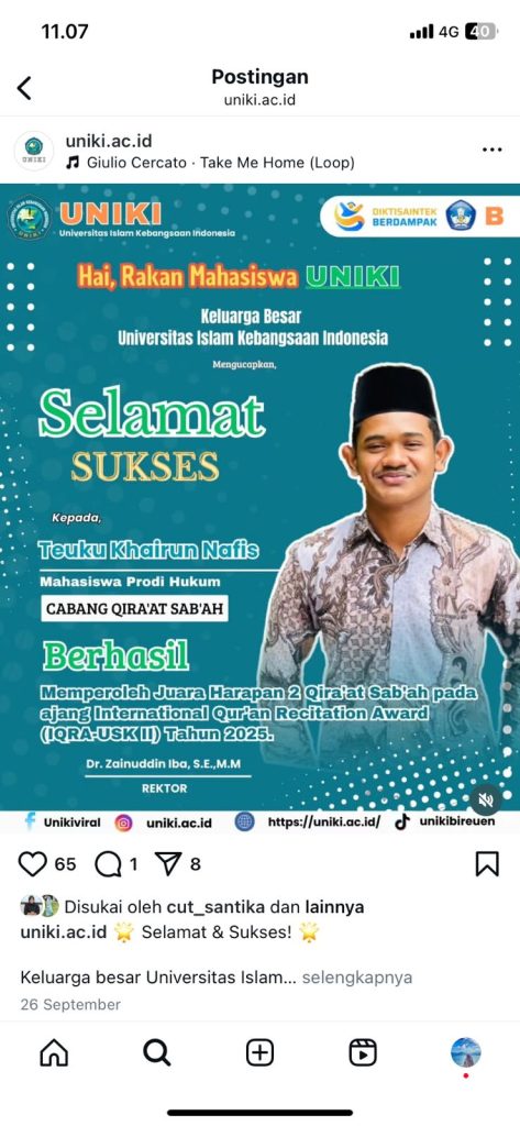 Prestasi Teuku Khairun Nafis ini membuktikan bahwa mahasiswa UNIKI tidak hanya unggul dalam bidang akademik, tetapi juga piawai dalam bidang keagamaan dan seni baca Al-Qur’an, khususnya pada cabang Qiraah Sab’ah yang menuntut pemahaman mendalam terhadap berbagai riwayat bacaan.